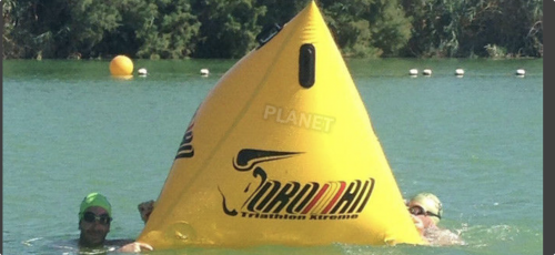 遅い選手を避けながら目印ブイを目指します。